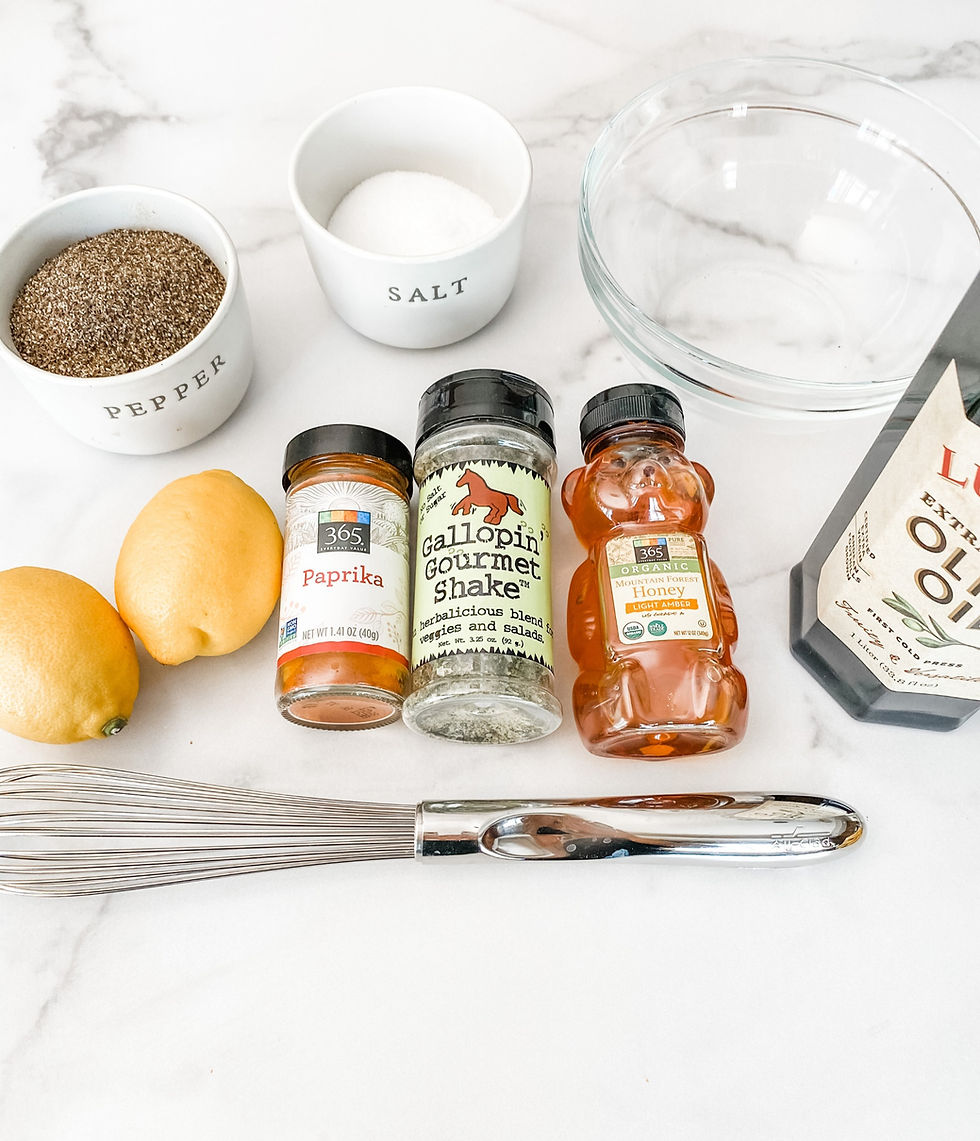 First things first lets discuss the seasoning! I used salt, pepper, garlic powder, paprika, gallopin' gourmet shake, some EVOO, lemon and honey.