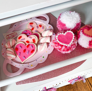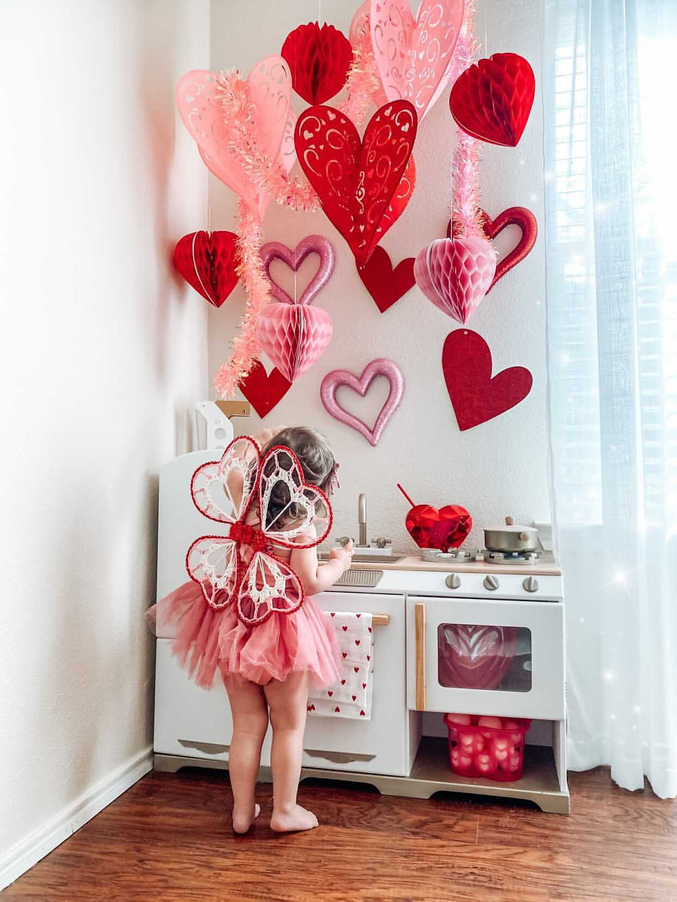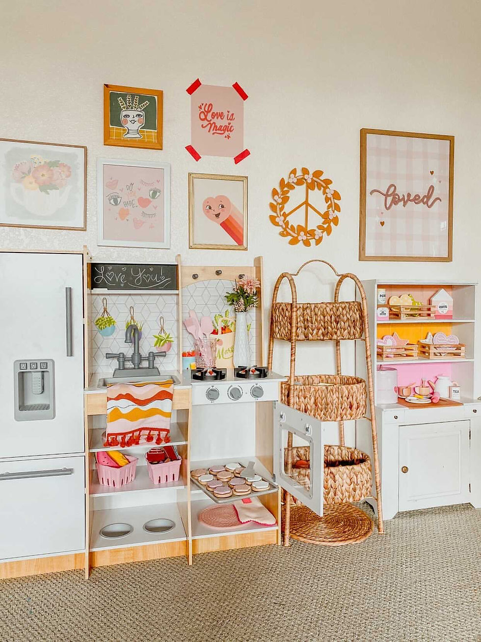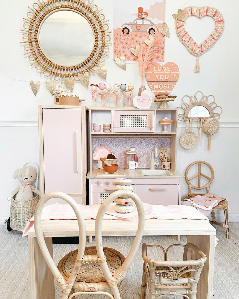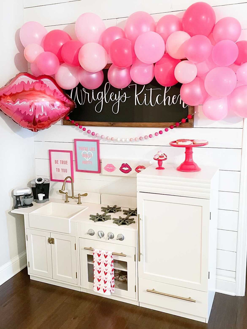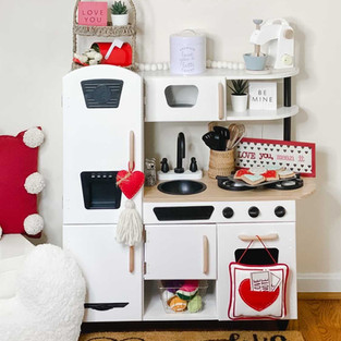 I love Kelsi's play kitchen because she always has the most whimsical decor for it! I am completely obsessed with the mylar hearts above it and how open and bright the space is!